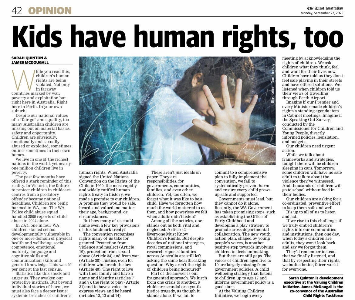 VCI's Sarah Quinton and Australian Child Rights Taskforce James McDougall collaborate in this an op ed published in The West Australian on 22/09/25.